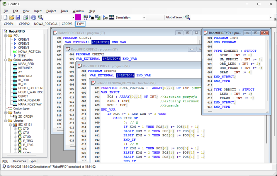 Oprogramowanie realizujące wielozadaniowy system rozproszony między różne jednostki wykonawcze przygotowano w środowisku CPDev [1] (w specjalnej wersji iConfPLC).